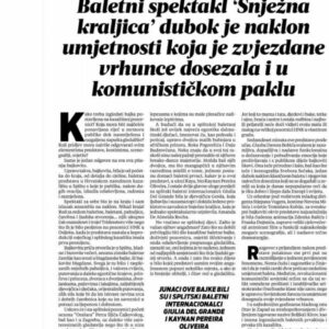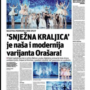 Snježna kraljica – Osvrt https://davorbobic.com/wp-content/uploads/2024/11/VID-20241129-WA0001.mp4 https://davorbobic.com/wp-content/uploads/2024/11/VID-20241129-WA0000.mp4 View this post on Instagram A post shared by Hrvatsko narodno kazalište Split (@hnk_split) [RECENZIJA] Snježna kraljica: Balet za sve generacije, bajkovit i raskošan, pravi dragulj i dokaz kakva se kvaliteta krije među hrvatskim skladateljima i koreografima Čak 83 plesača u baletu Snježna kraljica, najuzbuđenije su male balerine iz škole J. Hatze! Velika je to stvar, divne su eTV – Bobić o izvanrednom uspjehu baleta ‘Snježna kraljica’: ‘Nisam mogao vjerovati kada sam vidio toliki red za ulaznice’ Školovanje je za ovu profesiju dugotrajno i mukotrpno. Kako djeci objasniti da stalno treba vježbati, a uspjeh im nitko ne može garantirati